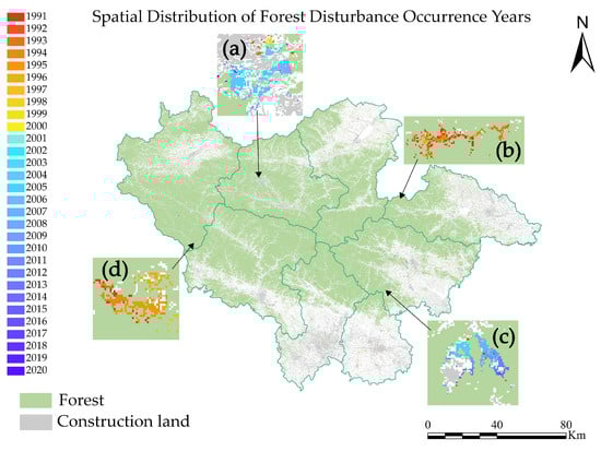 Spatial distribution of forest disturbances: (a,c) represent disturbances after 2000, while (b,d) represent disturbances before 2000.