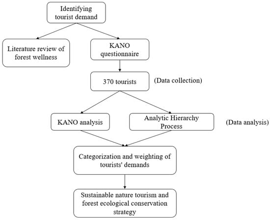 To address this research question, this study categorizes and weights tourist demands. The KANO model effectively identifies key factors affecting tourist satisfaction [57,58]. At the same time, AHP further clarifies the relative weights among demands, providing a scientific basis for developing more targeted sustainable nature tourism strategies. This study aims to identify the types of tourist demands and their importance in forest wellness tourism in Royal Belum State Park. It also hopes to provide practical guidance for sustainable tourism management in the park by integrating with forest ecological conservation. Figure 1 clearly shows the research approach of this study.