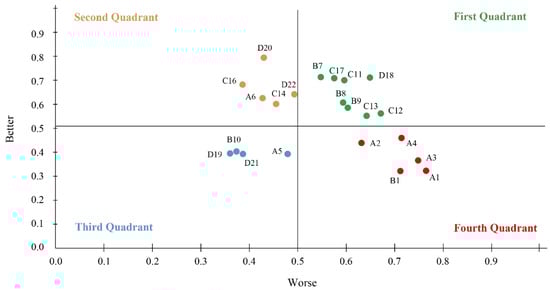 According to the results from the data, five indicators are must-be qualities, which are high forest coverage rate (A1), varied wildlife (A2), comfortable climate (A3), good air quality (A4), and efficient and rapid medical emergency (C15); eight are one-dimensional qualities, which include convenient traffic (B7), reasonable route layout (B8), reasonable public facilities setting (B9), clean sanitation (C11), good accommodation facilities (C12), healthy diet (C13), abundant projects (C17), and entertainment (D18); five items are one-dimensional qualities include entertainment (D18); five are of attractive quality, including unique human resources (A6), shopping with a good experience (C14), equipped with professional health care staff (C16), recovery care staff (C16), recovery and recuperation (D20), and parent–child activities (D22); 4 are different qualities, including good water quality (A5), detailed boot identification (B10), knowledge learning (D19), and exercise and fitness (D21). There were no reverse qualities. Also, based on the better–worse values of the 22 tourist demands, we can obtain a quadrant map, as shown in Figure 3.