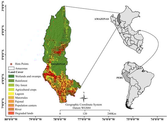 The study was conducted in the department of Amazonas, located in northeastern Peru in South America; this department is located between latitudes 3°0′ S and 7°2′ S and longitudes 77°0′ W and 78°42′ W. Amazonas presents a remarkable altitudinal variation, ranging from 169 m above sea level in the lowest parts to 4242 m above sea level in the highest parts (Figure 1), and its topography is quite rugged with a large number of mountains, which causes the climatic variation to be very marked. In the lowest areas, maximum temperatures reach 40 °C, while in the highest areas, minimum temperatures can drop to 2 °C. Annual rainfall varies significantly, with deficits of up to 924 mm in some areas and surpluses exceeding 3000 mm in others [68]. Amazonas has a great ecosystemic wealth due to its geographical location and its climatic and topographic qualities. This department has ecosystems such as Jalca, seasonally dry forests, montane forests, and lowland rainforests, which are home to a large number of endemic fauna and flora, such as gallito de las rocas (Rupicula peruvianus), oso de anteojos (Tremarctos ornatos), colibri cola de espátula (Loddigesia mirabilis), and timber trees with great economic and ecosystemic value, such as Cedrela sp., Ceiba sp., and Cedrelinga cateniformis, among others. In the department of Amazonas, the Amazonian Andes and grasslands cover 13.9% of the territory, and seasonally dry and humid forests represent 86.1% of the surface. The soils are varied, influenced by climate, relief, geological structure, vegetation, and human intervention, reflecting the complexity and ecological richness of this territory.