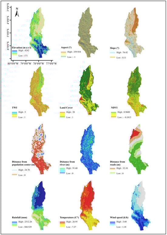 The variables considered in the social factors were distance to roads, rivers, and population centers [95,96]. The Ministerio de Transporte y Comunicaciones Platform (https://portal.mtc.gob.pe/estadisticas/descarga.html, accessed on 16 February 2023) provided the road database. River data were obtained from the Autoridad Nacional del Agua platform (https://www.geoidep.gob.pe/autoridad-nacional-del-agua-ana, accessed on). Details about the population centers were extracted from the Instituto Nacional de Estadística e Informática (INEI) platform (http://sige.inei.gob.pe/test/atlas/, accessed on 16 February 2023). These variables were generated from the Euclidean distance in the QGIS (v 3.36.3) software with the r.grow.distance tool; the Euclidian distance is used to measure the proximity between geographic points [91,97].
