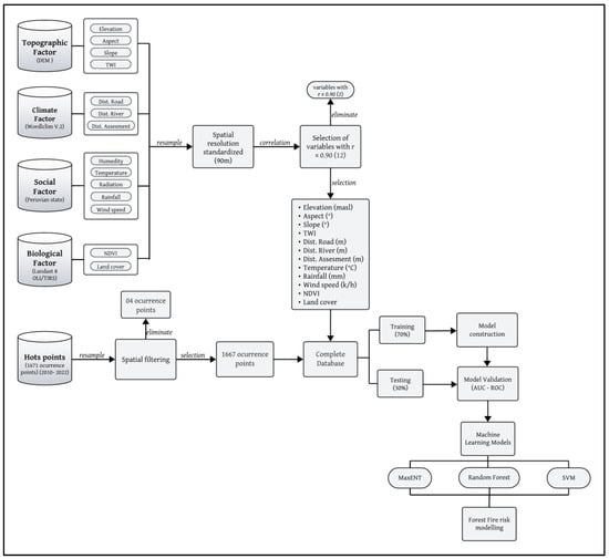 The methodological process developed in this research can be seen in the methodological flowchart (Figure 3). The flowchart shows the methodological process, comprising four (04) steps: (1) selection of predictor variables classified into four types (topographic, climatic, social, and biological factors) and prioritization of variables through correlation calculations (r ≤ 0.9); (2) construction of a set of samples (hot points); (3) wildfire susceptibility modeling approaches based on three ML models (RF, SVM, MaxEnt); and (4) model evaluation and generation of fire risk maps based on the optimal model.