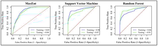 The accuracy of the machine learning models had significant accuracy performance (Table 2), because the AUC values were between 0.84 and 0.91, Accuracy values were between 0.8513 and 0.8756, F1-score values were between 0.9054 and 0.9285, Recall values were between 0.8774 and 0.9624, and Precision values were between 0.9560 and 0.9860. The Random Forest model presented the highest performance of the three models and showed an AUC of 0.91 (Figure 4), where the blue and green lines indicate how accurate the model was in both the training (blue line) and validation (green line) phases and the red line indicates a random classifier. Table 2 presents the results of additional statistical metrics to validate the performance of the models used, where it can be seen that the MaxEnt model had the worst results, with Accuracy of 0.8513, F1 score of 0.9054, and AUC of 0.84. On the other hand, the Random Forest model presented more uniform results, with an AUC of 0.91, Accuracy of 0.8694, and F1 score of 0.9176.