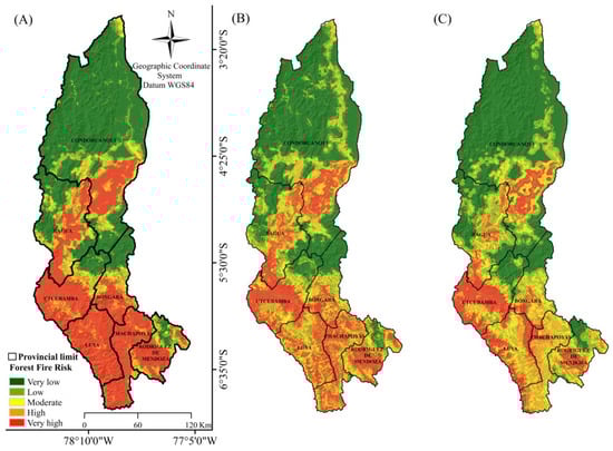 Forest fire risk maps. (A) SVM, (B) Random Forest, (C) MaxEnt.