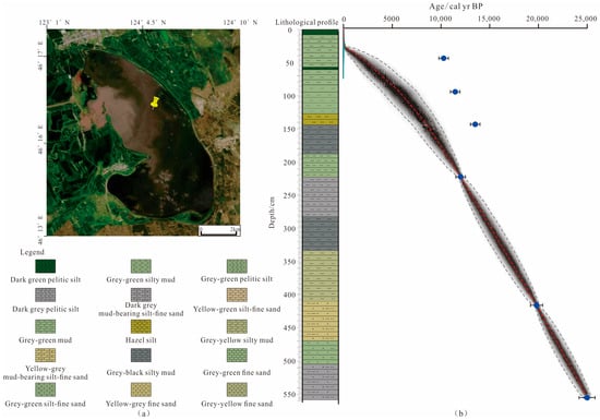 The regional upper Quaternary strata here include the Middle–Upper Pleistocene Qiqihar Formation (Qp2–3q), the Upper Pleistocene Daxingtun Formation (Qp3d), Holocene high floodplain sediments (Qh1–2fp), low floodplain sediments (Qh2–3fp), lacustrine sediments (Qh3l), swamp sediments (Qh3s), and aeolian sediments (Qh3e) [61]. According to the regional background, the dark, gray–green, and gray–yellow silty sand–mud of 558–189 cm (fluvial-lacustrine facies) exhibited simultaneity with the Daxingtun Formation, which was found to be composed of sub-clay, sand, and silty sand, while the gray–black sandy mud at 189–0 cm (lacustrine facies) exhibited simultaneity with Holocene lacustrine sediments. Therefore, the studied section at 558–0 cm represents the Daxingtun Formation and the Holocene.