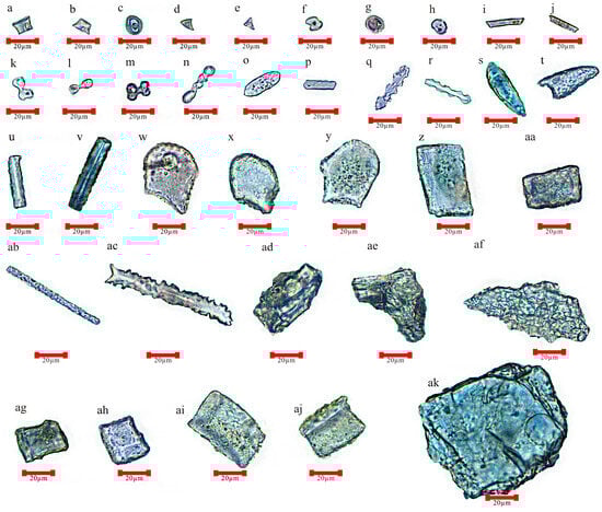A total of 14 types of phytoliths were identified in this profile: conifer type (Figure 3ag–ak), broad-leaved (Figure 3ad–af), bulliform flabellate (Figure 3w–y), short saddle (Figure 3f–h), long saddle (Figure 3i–j), hat (Figure 3d–e), trapeziform polylobate (Figure 3q–r), lanceolate (Figure 3s–t), entirely elongate (Figure 3ab), square, rectangle (Figure 3z–aa), Pteridophyte-type (Figure 3u–v), bilobate (Figure 3k–m), and cylindrical polylobate (Figure 3n).