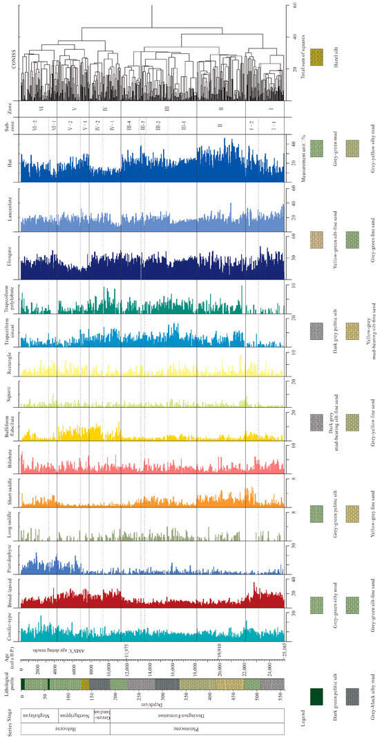 - Grimm, E.C. CONISS: A FORTRAN 77 program for stratigraphically constrained cluster analysis by the method of incremental sum of squares. Comput. Geosci. 1987, 13, 13–35. [Google Scholar] [CrossRef]