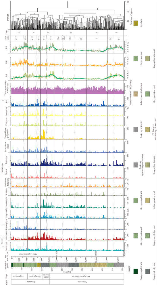For 22,180–18,080 cal aB.P., the average values of Iw (0.15) and Iph (0.59); the high phytolith concentration and LOI550; and the low D/P, Pi/P, T/P, and PC1 indices corresponded to the coldest and driest state. This was also reflected by the deep-yellow silty mud. During this period, glaciers in the Alps, North America, and North Europe extended [6], the sea level declined [84], and herbaceous vegetation in East Asia expanded [8], expressing characteristics of the Last Glacial Maximum (LGM). Therefore, it was inferred to be the LGM.