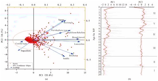 In Figure 6, the first and second axes capture 55.9% and 10.5% of the total variance, respectively, with a 95% confidence ellipse. On the axis of PC1, square, rectangular, triangular rod-shaped, bulliform flabellate, broad-leaved, lanceolate, saddle, and bilobate phytoliths have positive loadings, while conifer and trapeziform polylobate phytoliths have negative loadings. On the axis of PC2, square, rectangular, triangular rod-shaped, bulliform flabellate, and broad-leaved phytoliths have positive loadings, while trapeziform polylobate, saddle, bilobate lanceolate, and conifer phytoliths have negative loadings. Thus, PC1 represents the temperature, with higher loadings indicating higher temperatures, and PC2 represents humidity, with higher loadings indicating higher humidity.