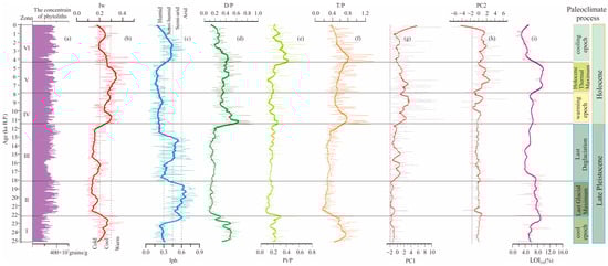 The paleoclimate process documented by phytoliths in the studied profile. (a) Changes in phytolith concentration; (b) the Iw index curve; (c) the Iph index curve; (d) the D/P index curve; (e) the Pi/P index curve; (f) the T/P index curve; (g) the score curve of the first principal component axis (PC1); (h) the score curve of the second principal component axis (PC2); (i) LOI550 curve. From b to i, the fine serrated line represents the index changes with depth and the thickened line in it represents the index changing trend.