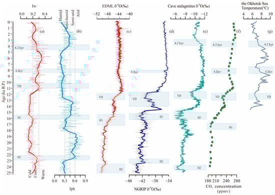 In this study, the phytolith indices expressed the H2, H1, YD, 8.2 kyr, and 4.2 kyr events obviously, which synchronized with the oxygen isotope record in the Antarctic EDML ice core [113], the Greenland NGRIP ice core [114,115], and the global CO2 concentration changes [116], showing global characteristics.
