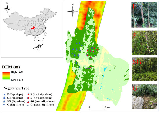 Soil sampling was carried out on four vegetation types on both dip and anti-dip erosion slopes between 21 and 30 August 2023. There had been no rainfall for two weeks before the sampling date. Field investigations revealed significant bedrock exposure in the study area, characterized by a predominantly shallow soil layer that typically does not exceed a thickness of 30 cm. The experimental design included three independent replicate plots measuring 20 m × 20 m each for every vegetation type [8]. These plots were carefully selected to have similar slope aspects, elevations, soil parent material, and other relevant factors. At each sampling site, five soil samples were collected at depths of 0–10 cm in an “S” shape [31]. To ensure the spatial independence of the soil nutrients and microbial variables, the distance between replicate plots within the same vegetation type was maintained at approximately 100 m. A total of 240 soil samples were collected in this study (5 replicate samples × 4 vegetation types × 2 bedrock strata dips × 3 replicate samples). All the soil samples were analyzed for their physical and chemical properties as well as their soil enzymatic activity.