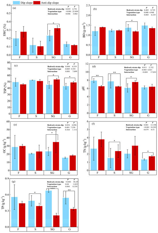The influence of vegetation type on the physicochemical properties of soil in dip/anti-dip erosion slopes. Note: (a) SWC: soil water content; (b) BD: soil bulk density; (c) TSP: total soil porosity; (d) PH: pH; (e) OC: organic carbon; (f) TN: total nitrogen content; (g) TP: total phosphorus; G: four stages: grasslands; SG: transitional grass–shrub; S: shrubland; F: secondary forest. Significant differences between treatments, denoted by different asterisk number, “*” is statistically significant at the p < 0.05 level; and the “**” is statistically significant at the p < 0.01 level; “***” is statistically significant at the p < 0.001 level. The graph also presents the standard deviation.