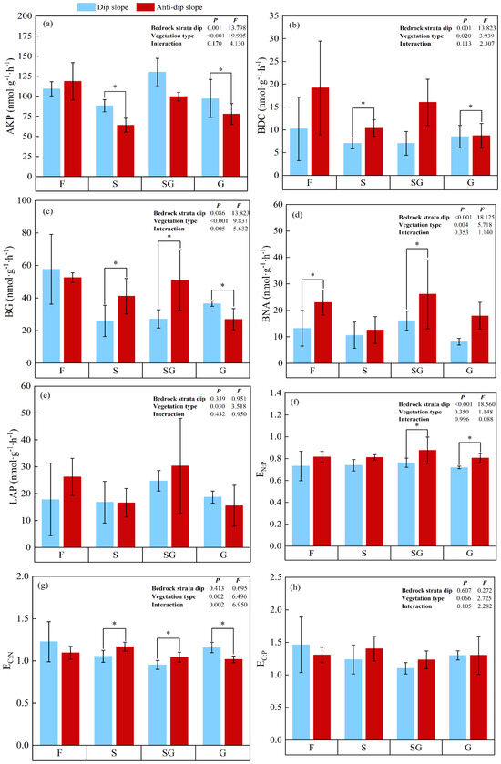 Soil enzyme activities and its stoichiometry under different vegetation type on dip/anti-dip erosion slope. Note: Samples from different vegetation types at dip/anti-dip slopes, respectively. (a) AKP: acid phosphatase; (b) BDC: β-D-cellobiosidase; (c) BG: β-1,4-glucosidase; (d) BNA: β-1,4- N-acetylglucosaminidase; (e) LAP: L-leucine aminopeptidase; (f) EN:P: the ratio of (BNA + LAP) and AKP; (g) EC:N: the ratio of (BG + BDC): (BNA + LAP); (h) EC:P: the ratio of (BG + BDC):AKP; G: four stages: grasslands; SG: transitional grass–shrub stages; S: shrubland stage; F: secondary forest stage; Significant differences between treatments, denoted by different asterisk number, “*” is statistically significant at the p < 0.05 level. The graph also presents the standard deviation.