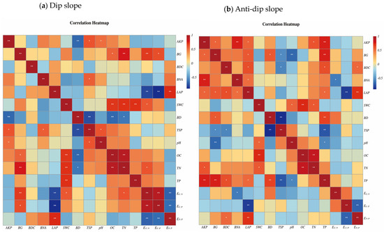 Correlation heatmap of soil physicochemical properties and soil enzyme activities under different vegetation types on dip and anti-dip slopes. Note: All abbreviations in this figure are consistent with those in Figure 2 and Figure 3. Significant differences between treatments, denoted by different asterisk number, “*” is statis-tically significant at the p < 0.05 level; and the “**” is statistically significant at the p < 0.01 level.