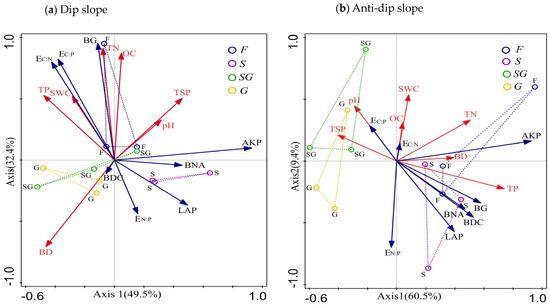 Both the vegetation type and the dip of the bedrock strata significantly influenced the soil enzyme activity (p < 0.01). Compared with the other three vegetation types, the SG vegetation type presented significantly greater mean values for AKP, BNA, LAP, and EN:P, indicating that SG had the highest overall soil enzyme activities among the vegetation types. Conversely, SG presented the lowest levels of EC:N and EC:P. In contrast, S presented the lowest mean values for AKP, BNA, and LAP. Furthermore, F presented the highest BG, BDC, EC:N, and EC:P activities, whereas G presented the lowest BG and BDC activities. S clearly presented the highest C-related soil enzyme activities. Additionally, anti-dip erosion slopes presented significantly greater mean BG, BDC, BNA, LAP, EC:P, and EN:P activities than dip erosion slopes did, indicating that anti-dip erosion slopes presented higher C- and N-related soil enzyme activities. However, AKP activity on dip erosion slopes ranged from 75.51 to 149.61 nmol·g−1·h−1, which was slightly higher than the range observed on anti-dip erosion slopes (56.19–135.6 nmol·g−1·h−1). Moreover, BG, LAP, and EC:N activities were significantly greater on the G of the dip erosion slope than on the anti-dip erosion slope, suggesting that the G of the dip erosion slope had higher C-related soil enzyme activities (Figure 3).