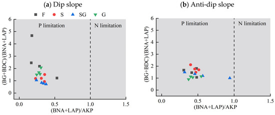 The analysis of ecological enzyme stoichiometric ratios revealed significant phosphorus (P) limitation without nitrogen (N) limitation in the vegetation types employed on both dip slopes and anti-dip slopes, as indicated by all ratios of (BNA + LAP)/AKP exceeding 1 (Figure 6). Additionally, the mean ratio of (BG + BDC)/(BNA + LAP) in the SG of the dip slope was found to be less than 1, whereas it exceeded 1 for the other vegetation types. The presence of SGs on dip slopes contributes to microbial C and P limitations. Specifically, the vegetation type on the anti-dip slope is predominantly constrained by C and P.