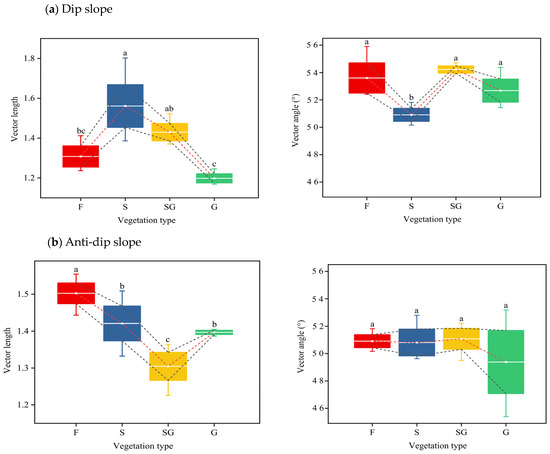 Variation of vector length and angle under different vegetation types on dip and anti-dip slopes. Note: all abbreviations in this figure are consistent with those in Figure 2 and Figure 3. Significant differences between treatments, denoted by different lowercase letters (e.g., a, b), are statistically significant at the p < 0.05 level. The graph also displays the standard deviation.