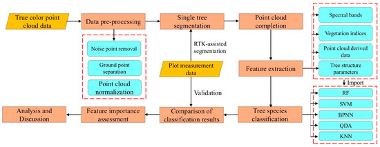 Firstly, the obtained true-color point cloud data of the forest stand was preprocessed to eliminate the impacts of noise and ground points. The single tree was then segmented using LiDAR360’s point cloud segmentation tools. Considering the possible loss of the crown point cloud after segmentation, the traditional geometric method and the method based on deep learning were, respectively, used to complete the point cloud, so as to ensure the integrity of the tree point cloud sample and compare the completion performance of different methods. Secondly, the RGB features and LiDAR point cloud features were extracted, respectively, including spectral band, vegetation index, point cloud derived data, and tree structure parameters. Five machine learning classifiers, including RF, SVM, BPNN, QDA, and KNN were used to identify tree species, and the classification results were compared and analyzed. Finally, the classifier with the highest accuracy was selected to rank the importance of all feature indicators, and the impact of different features on the classification results of tree species was discussed through importance analysis. The technical route is shown in Figure 2.