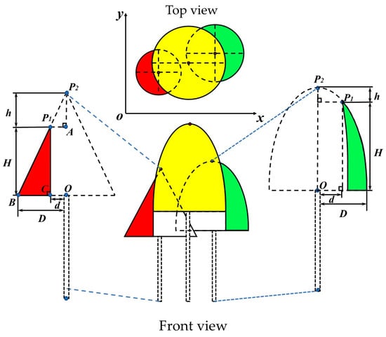 - When distinct trunk points are absent in the individual tree point cloud, the crown is completed based on the morphological structure of conifer and broadleaf trees, as shown in Figure 3. The colored regions represent the existing crown, while the dashed areas simulate the missing crown, and the combination of the two forms is the complete crown. In the given conifer (broadleaf) tree model, P1 is the highest point in the missing crown point cloud, P2 is the vertex of the complete crown, h is the vertical distance between P1 and P2, and H is the crown height of the missing crown. The Hough transform is used to fit the edge points of the crown to extract the center point O of the tree and the radius D of the fitted circle. Based on the coordinates of point P1 (x1, y1), the distance d between the tree center O and the point P1 in the xoy plane is calculated. Finally, the following calculations can be derived using the theory of similar triangles and the ellipse equation:
