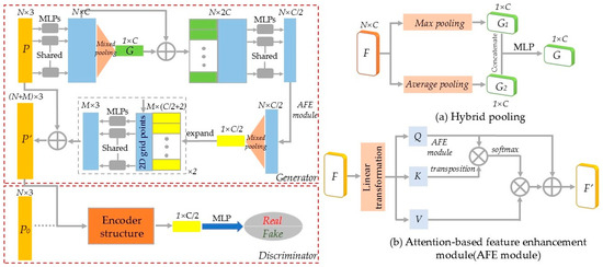 Point cloud completion network based on GAN. (a) Hybrid pooling. (b) Attention-based feature enhancement (AFE) module.