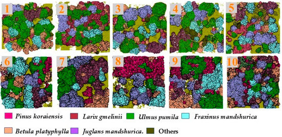 The study area is located within the Mao’ershan Experimental Forest Farm in Mao’ershan Town, Shangzhi City, Heilongjiang Province, China (127°30′~127°34′ E, 45°20′~45°25′ N). The forest farm is 30 km long from north to south and 20 km wide from east to west, with a total area of 26,000 hectares. The existing forest types of the forest farm include natural secondary forests at different stages formed after destruction and succession from the original zonal climax community and artificially planted forests [45,46]. The dominant tree species include Larix gmelinii, Pinus koraiensis, Ulmus pumila, Betula platyphylla, Fraxinus mandshurica, Juglans mandshurica, Tilia amurensis, Populus davidiana, etc. In the study area, 10 plots (50 m × 50 m) were selected by the method of uniform sampling. Each tree (DBH > 5 cm) in the plots was measured and the tree species, DBH, tree height, height under branches, and crown width were recorded. The tree position was marked by a RTK (Qianxunxingyao X) manufactured by Qianxun Spatial Intelligence Ine. The summary of the field measurements is shown in Table 1. The six tree species in Table 1 were classified as coniferous (Pinus koraiensis, Larix gmelinii) and broad-leaved (Ulmus pumila, Fraxinus mandshurica, Juglans mandshurica., Betula platyphylla) trees. The location of the study area is shown in Figure 1.