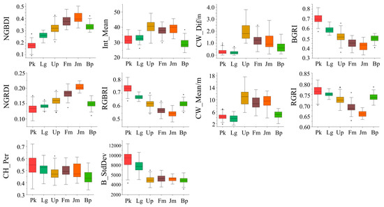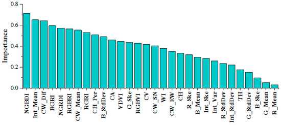 Since the data acquired by the UAV contains both visible band and 3D point cloud information, the extraction of features can be divided into visible band feature extraction and 3D point cloud information feature extraction. The feature extraction of RGB information includes 9 features of mean, standard deviation, and skewness for the red, green, and blue bands, and 8 features of vegetation index selected based on RGB bands calculation [57,58,59,60,61,62,63], including NGRDI, NGBDI, VDVI, RGRI, BGRI, WI, RGBRI, and RGBVI.