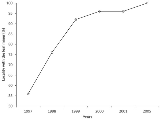 Percentage of localities out of 22 studied with horse chestnut infested by Cameraria ohridella over the sampling years.