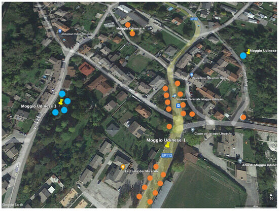 Position of the four sites at locality N. 13. The plants subjected to trunk injections of abamectin are indicated in orange and the untreated ones in blue. The distance between the untreated plants and the closest treated plants was always less than 150 m.