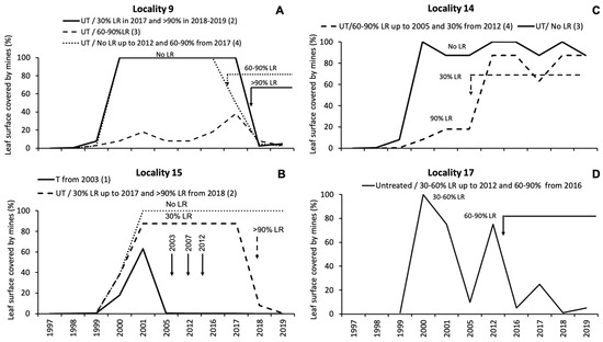 Dynamics over the years of leaf damage from Cameraria ohridella in sites at four localities (A–D) subjected to trunk injections with abamectin (T) or variations in leaf removal levels (LR) compared to control sites. UT = untreated. The number of the site inside each locality, according to Table S2 of the Supplementary Materials, is reported between breaks in the legends.