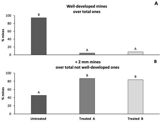 Percentage of well-developed mines over total mines ((A), above) and percentage of mines < 2 mm over total not-well-developed mines ((B), under) in one untreated plant and two plants treated with abamectin. Different capital letters above columns indicate significant differences at the 0.01 level with Ryan’s test.