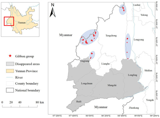 - Fan, P.F.; Wen, X.; Sheng, H. Distribution and conservation status of the Vulnerable eastern hoolock gibbon Hoolock leuconedys in China. Oryx 2011, 45, 129–134. [Google Scholar]
