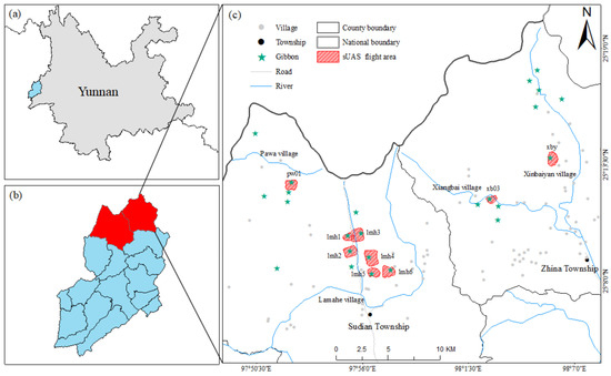 Map of the study area: green pentagrams indicate the distribution of Gaoligong hoolock gibbon (Hoolock tianxing) in Sudian and Zhina Townships; red areas are areas photographed by drone flights. (a) is Yunnan Province, (b) is Yingjiang County, and (c) is the study area in Sudian Lisu Autonomous Township and Zhina Township.