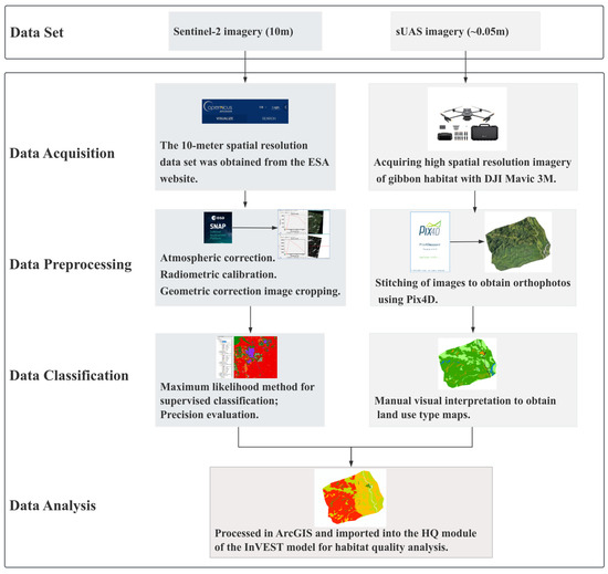 Given the critically fragmented habitat of the Gaoligong hoolock gibbon in Yingjiang County, where small, isolated subpopulations are confined to habitat patches within a human-dominated landscape, this study aims to (1) assess the habitat quality of individual patches using sUAS photography; (2) apply the InVEST Habitat Quality (IHQ) model to quantitatively evaluate habitat quality; and (3) compare the performance of sUAS imagery against 10 m resolution Sentinel satellite data at the patch scale, based on varying image resolutions. By pursuing these objectives, this research intends to emphasize the significant value of high-resolution sUAS data in guiding targeted conservation efforts for this endangered primate species facing complex ecological and human-induced challenges. Specifically, we integrate human visual interpretation with the IHQ model to quantitatively demonstrate the advantages of sUAS imagery in habitat quality assessment, thereby providing a strong scientific foundation for developing and implementing targeted habitat restoration measures.