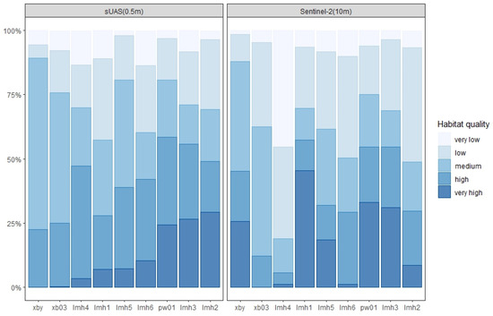 The results of this study highlight that spatial resolution is not just a technical detail but a crucial factor influencing both classification results and subsequent ecological analyses. This is evident when comparing high-resolution sUAS (0.05 m) and medium-resolution Sentinel-2 (10 m) imagery. As expected, sUAS imagery showed significantly higher classification accuracy than Sentinel-2 [37]. This is primarily because sUASs can resolve fine-scale landscape features that are indistinguishable at 10 m resolution. Sentinel-2’s inherent limitations in capturing localized surface variations lead to inaccuracies and potential biases in both land cover classification and habitat quality assessment, particularly in complex ecological environments. Indeed, in diverse landscapes, the choice of spatial resolution fundamentally shapes how habitat quality is perceived and interpreted, potentially leading to different ecological conclusions [62]. While differences in timing between datasets might have some influence, this discussion mainly focuses on the fundamental impact of spatial resolution as a key driver of variability in ecological assessments.