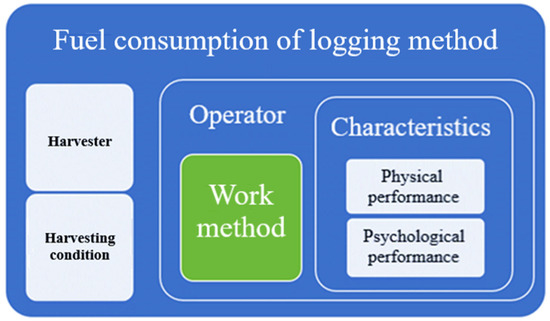 In fully mechanized tree logging, fuel consumption is impacted by three factors, i.e., the harvester, the operator, and the harvesting conditions (Figure 1). These factors can be further divided into sub-factors. For example, operator characteristics can be divided into physical and psychological performance [4]. In addition, the logging method can be considered, which refers to the way the operator of the harvester performs their harvesting work. This can be self-learned, or the operator can apply a standard logging method they learned in operator training [5]. To improve operators’ work, these methods can be developed and redesigned by applying the findings of time and motion studies [6], which compare the efficiencies of different logging methods in practice (e.g., fuel consumption, productivity). In the process, the influences of all other factors should be identified during data analysis. To that end, Palander [3] proposed that a combined human–machine (harvester–operator) system should be used in research analyses, and we took up their proposal in the present study.
