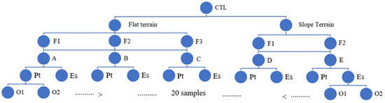 Study outline of three felling techniques, F1, F2, and F3, with five logging methods, A, B, C, D, and E, to compare them on flat and sloped terrains. Pt = pine (Pinus spp.), Es = Eucalyptus (Eucalyptus spp.), O1 = operator 1, O2 = operator 2.