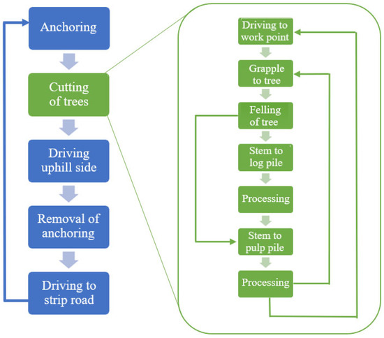 Niebel’s [6] research methods were used for efficiency comparisons of the logging methods. In addition, comparisons were made at the tree level. Work phases were observed visually using video material, which was processed using a video analysis tool developed for the research. During data collection and analyses of the logging methods, we used a designed motion chart, i.e., a dynamic system description of the work phases of the harvester–operator system (Figure 3).