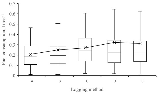 Average values of fuel consumption of the harvester–operator system by logging methods during the logging cycle process at the tree level. × = mathematical average, box line = median, A = sideways logging at the edge of the logging front, B = sideways logging inside of the logging front, C = forward logging in the middle of the logging front, D = sideways logging at the edge of the logging front with traction assistance on sloping terrain, E = sideways logging inside of the logging front with traction assistance on sloping terrain.