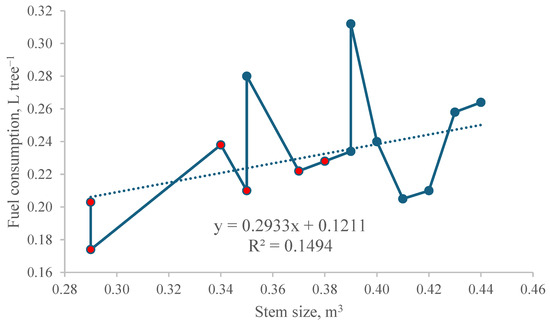 Effect of trees’ size (m3) on fuel consumption of harvester–operator systems during trees’ logging cycle process. Red points depict pine species and blue points depict Eucalyptus species.