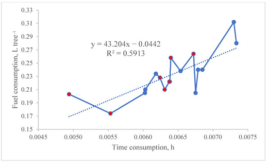 This analysis considered the harvester–operator system’s fuel consumption in the tree logging cycle process based on the average experimental values (Figure 5, Figure 6, Figure 7 and Figure 8). Fuel consumption was depicted in relation to potential regression variables: tree size (m3), effective time consumption (E0h), tree length (m), and tree processing speed (m h−1). The linear regression coefficients of determination (R2) for these were 0.15, 0.59, 0.32, and 0.12, respectively. The combined effects of these continuous variables were analyzed and modeled further, as reported in the next section, to determine their precise importance for tree logging cycle processes.