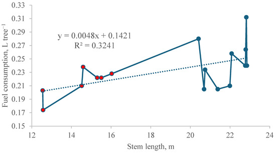 Effect of stem length (m) on fuel consumption of harvester–operator systems during trees’ logging cycle process. Red points depict pine species and blue points depict Eucalyptus species.