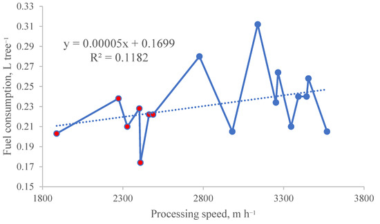 Effect of stems’ processing speed (m h−1) on fuel consumption of harvester–operator systems during trees’ logging cycle process. Red points depict pine species and blue points depict Eucalyptus species.