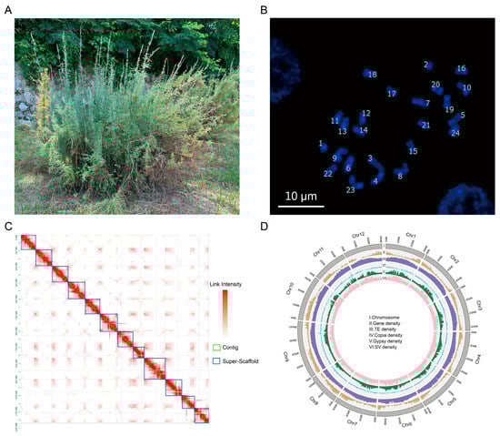 Genome assembly of M. laxiflora. (A). The field growth of M. laxiflora, which we named LS7. (B). Karyotype analysis plots used DAPI dye of M. laxiflora; bar = 10 μm. (C). Hi-C heatmap. The blue box on the diagonal represents the super-scaffold. The green box represents the contig., and the red represents the link intensity. (D). Circular representation of the pseudochromosomes. I: Ideogram of the 12 chromosomes, with scale in Mb. II: Gene density along each chromosome (number of genes per Mb). III: Repeat content along each chromosome (% nucleotides per Mb). IV: Copia retrotransposons content (% nucleotides per Mb). V: Gypsy retrotransposons content (% nucleotides per Mb). VI: SV density (% SV per Mb).