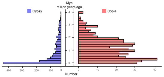 Insertion time distributions of Gypsy and Copia LTR (long terminal repeat–retrotransposons) elements. Mya means million years ago.