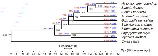 In order to further understand which gene families in the M. laxiflora genome have changed significantly during evolution, we analyzed the contraction and expansion of gene families. Ten different species were selected (Table S4), including rice as the outgroup and other closely related species for M. laxiflora. Among the ten species, a total of 14,687 gene families were identified, of which 6242 were present in all species. In addition, 120 single-copy orthologous genes were identified in the ten species. A phylogenetic tree analysis revealed that M. laxiflora was most closely related to Fagopyrum dibotrys, and the two species diverged by approximately 87 Mya (Figure 3).