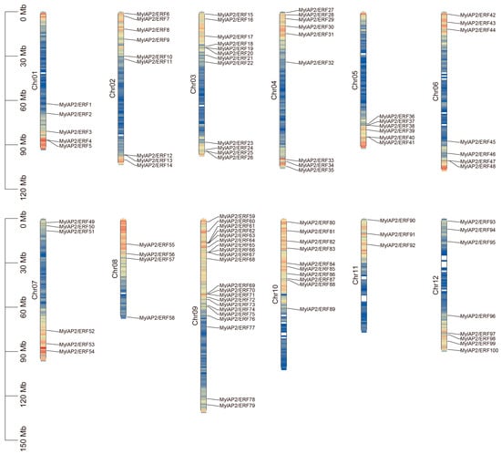 Distribution of AP2/ERF genes on 12 chromosomes of M. laxiflora genome. Colors in chromosomes represent gene density.