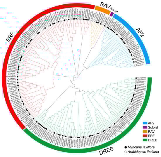 Phylogenetic tree of the AP2/ERF gene family from M. laxiflora and Arabidopsis. Different colors indicate the different subgroups.