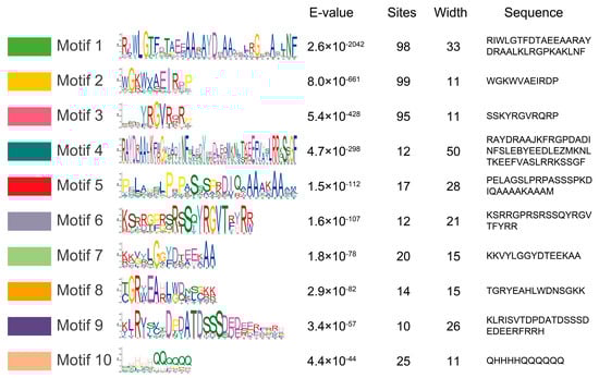 To identify the conserved motifs of MylAP2/ERFs, the MEME online tool was used for analysis. A total of 10 different conserved motifs were found in the 101 MylAP2/ERF members (Figure 6). The results showed that the sequence lengths of the 10 motifs ranged from a minimum of 11 amino acids (Motif 2, Motif 3, and Motif 10) to a maximum of 50 amino acids (Motif 4).