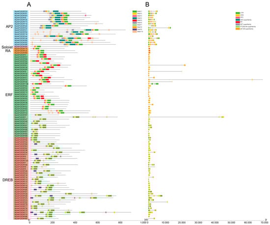 Gene structures and motif compositions of MylAP2s/ERFs from M. laxiflora. (A): Motif compositions of MylAP2s/ERFs. (B): Gene structures of MylAP2s/ERFs.
